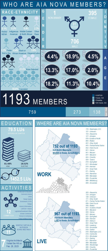 As of December 1, 2025, AIA Northern Virginia is one of the largest local AIA chapters in the country, with 1,193 members. Covering 25 cities and counties across the Commonwealth, our members reside and/or work in a range of settings, from urban and suburban to rural areas within the Chapter’s region. Below is an overview of our chapter membership and the diverse interest groups available for you to join.