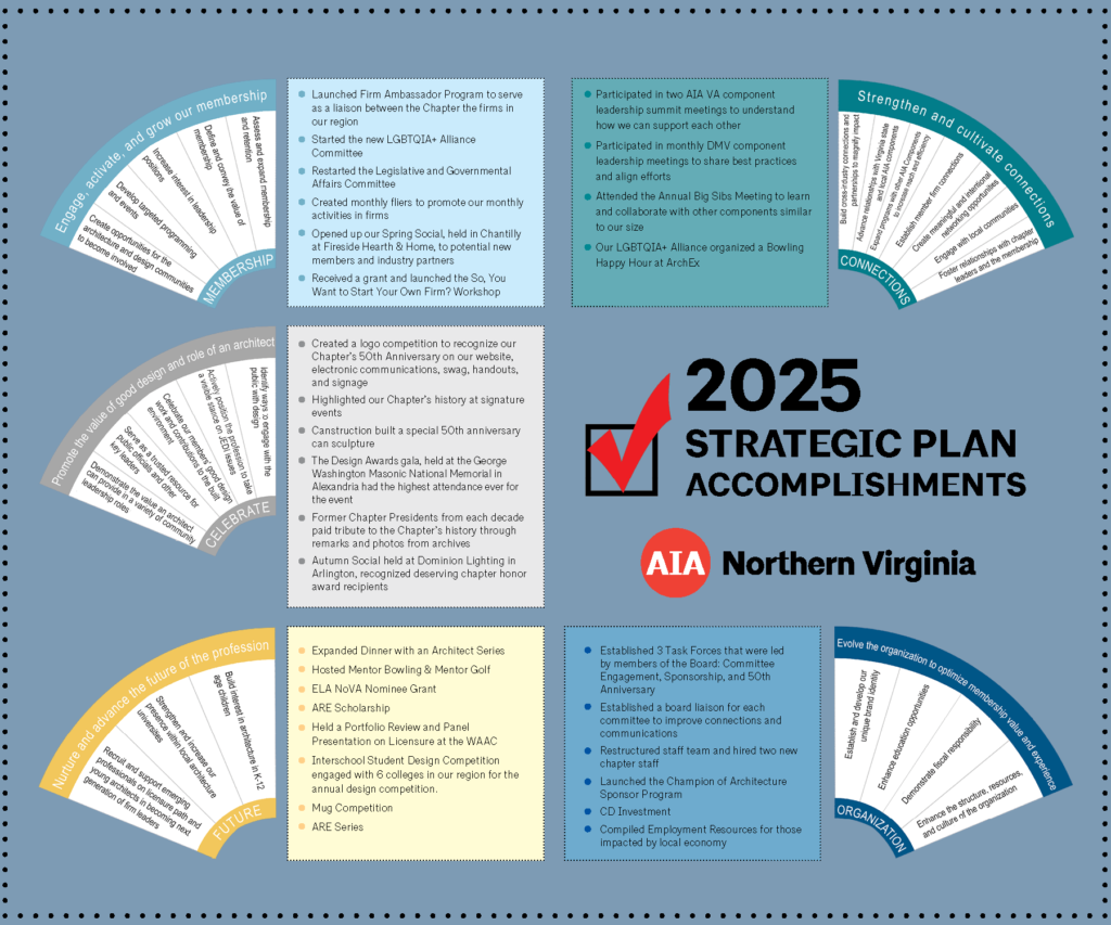 Strengthening relationships remained a priority through engagement with partner organizations, allied professionals, and peer AIA components. Chapter leaders participated in AIA Virginia component leadership summits, monthly DMV component meetings, and the Annual Big Sibs Meeting, fostering alignment, sharing best practices, and extending our regional impact.