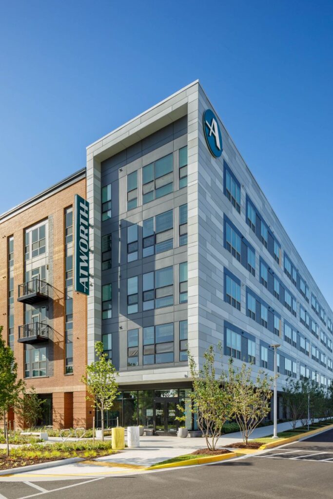 Atworth, in College Park, MD, was envisioned as a model for the community benefits of transit-oriented multifamily development. The site is located on the east side of the city, an underdeveloped, car-oriented area east of the University of Maryland. When Atworth was proposed, it was clear that embracing the regional Metrorail system was key to the success of the project. The master plan and architectural design leaned into the aesthetics and connectivity of the adjacent DC Metro, regional commuter rail, and the planned light rail, highlighting the economic and social benefits these systems offer. It was delivered as an affordable apartment project near the College Park Metro Station and future Purple Line. The project’s social, economic, and environmental benefits include reduced car usage, increased job accessibility, and enhanced economic potential for the area, enriching the community fabric, and expanded opportunities for residents to thrive.