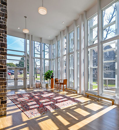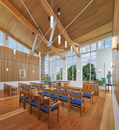 Leveraging the value of its property in response to changing trends in the religious sector, Hecker House provides a new home for the Paulists while simultaneously allowing redevelopment of St. Paul’s College as community charter schools and opening up ‘new’ land in an established neighborhood for sought-after housing stock. Interior space design facilitates the Paulists’ core mission of media outreach to demographics outside traditional evangelization, such as women and the LGBTQ community. This includes enhanced acoustic treatment of chapel surfaces for recording/streaming, a dedicated media control studio, and raised floor and video wall in the meeting hall to accommodate A/V/IT flexibility. Hecker House has a unique occupant group of seminarians, priests, and retired clergy. Sleeping units are suitable for permanent communal living for priests and retirees (necessitating heightened accessibility throughout), as well as student use during the academic year.