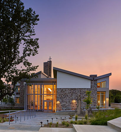 Set on a historically forested site that was once farmland in the 1900s, the architecture of Hecker House not only satisfies functional needs, but also promotes endeavors, elicits responses, and communicates meaning. Forms and materials reinforce meaningful context for the Paulist priests. Functional roof forms and drainage piers, for instance, architecturally reimagine the traditional book-and-sword iconography of the community’s patron, St. Paul the Apostle, while exposed chapel trusses evoke formal memory of the hammerbeam ceiling of the Paulists’ historic sanctuary, though in a modern idiom suited to the space. Patterning of the exterior brise soleil, overlaid on that of mullions and structure, evokes traditional leaded glass window walls, while varying in configuration within a common kit-of-parts to respond most effectively to different solar orientations, merging function with aesthetic form.