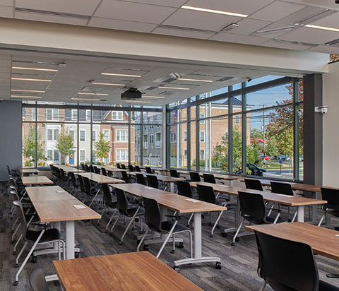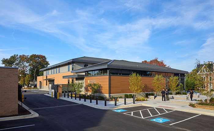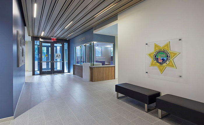 Designed to integrate seamlessly into the fabric of the surrounding neighborhood, Vienna’s new 29,441-square-foot police headquarters reflects the scale and character of nearby buildings while introducing a civic presence grounded in transparency and approachability. More than a municipal facility, the headquarters doubles as a public amenity, with a community meeting room and a landscaped plaza nestled between the historic Bowman House and the new structure—thoughtfully activating the space between old and new.