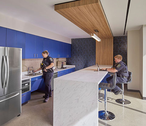 Following demolition of the previous building, the site was redeveloped to accommodate a unified facility that houses all police divisions under one roof. Upgraded technology, enhanced security, and thoughtful circulation support both staff needs and community access. Safety was paramount, with crime prevention through environmental design (CPTED) strategies subtly embedded throughout: landscape elements stand in for bollards, secure parking is separated for staff and the public, and lighting design, allowing for visibility without light trespass onto neighboring properties.